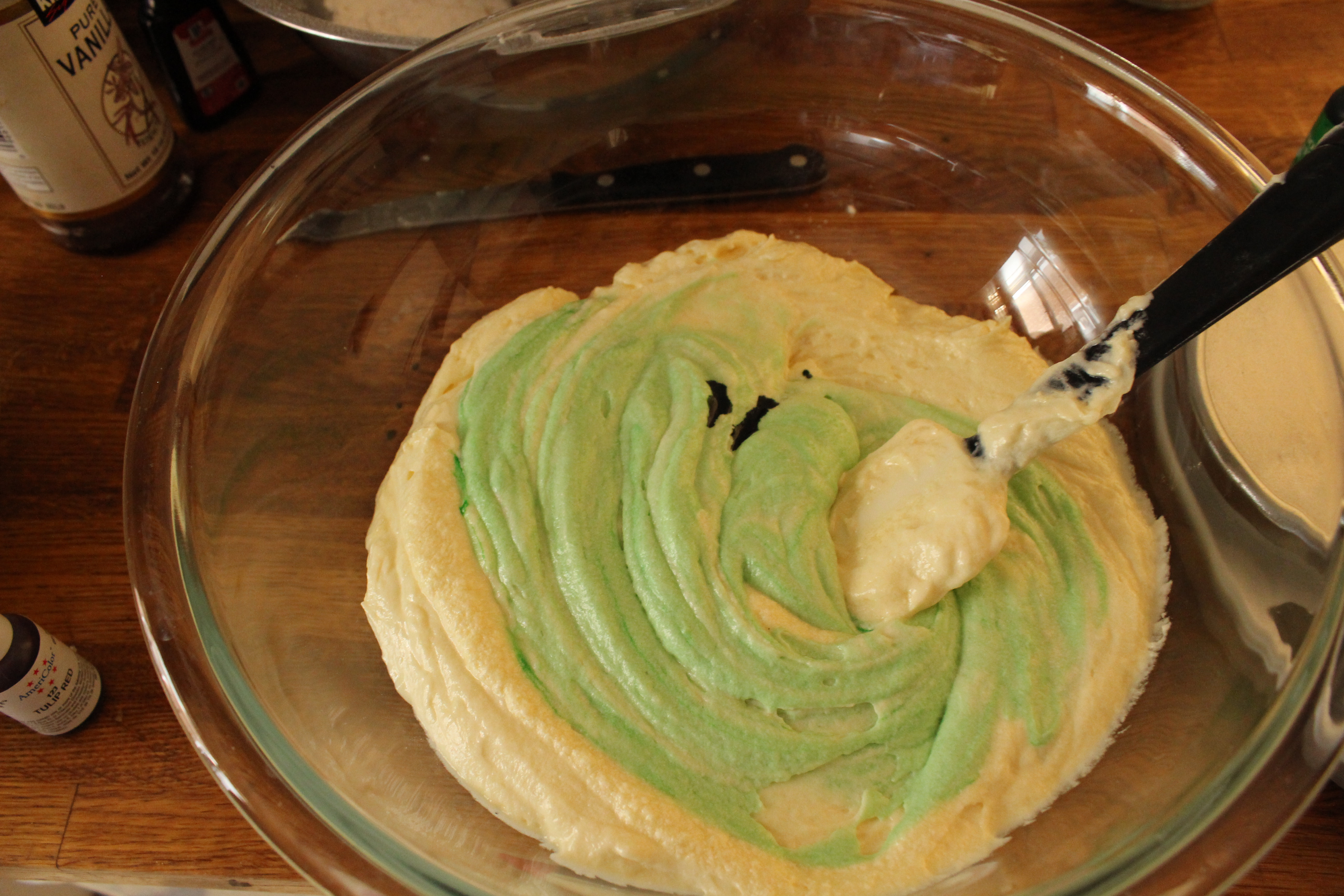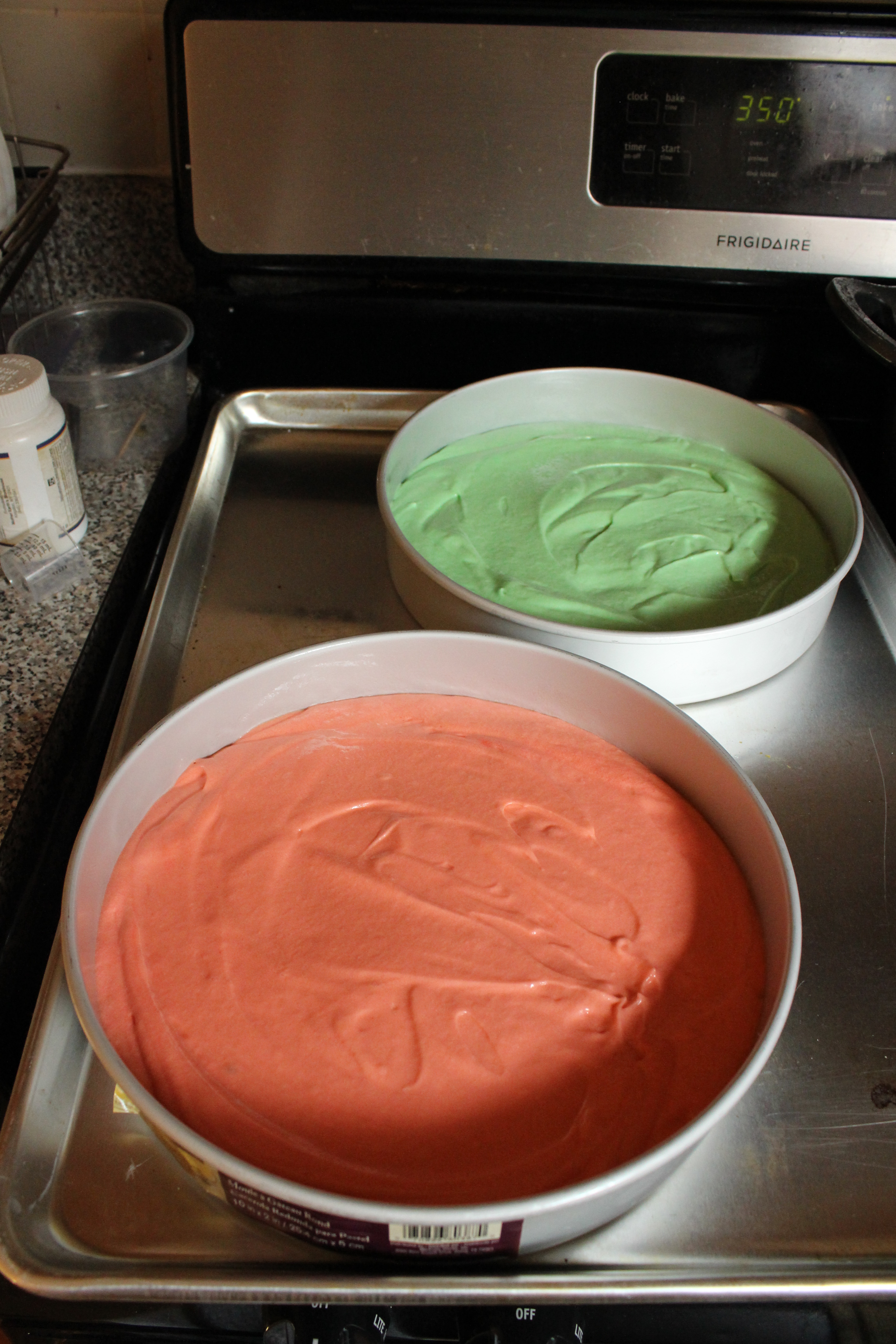 - Divide the batter between three bowls as evenly as you can (I used a kitchen scale to ensure even distribution). Leave one of them untinted, or tint with 2 drops yellow food color. Tint one of them green (drop 2 drops food color and mix with a spoon or spatula; the color will appear minty). Tint the final one red (the color will appear more salmon like than true red). Take care to use separate tools for each bowl so the colors don't mix. Gently pour the batter into the three previously prepared cake pans, red in one, green in one and yellow in one. Smooth out the top and tap on the counter 2-3 times each to get rid of air bubbles.* Bake in preheated oven for 20 to 22 minutes. The edges should start to pull away from the sides of the pan and the top should spring back when touched.