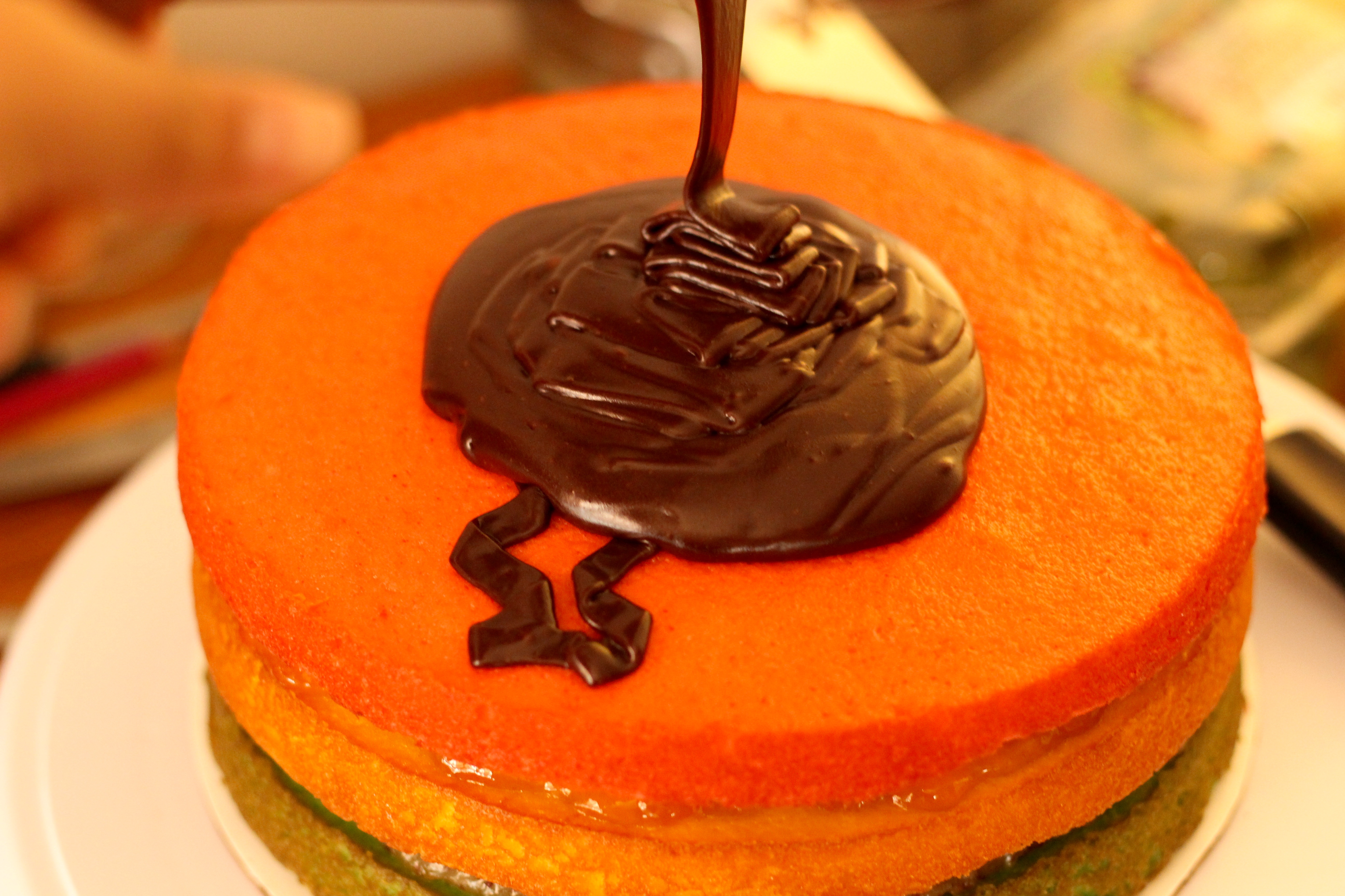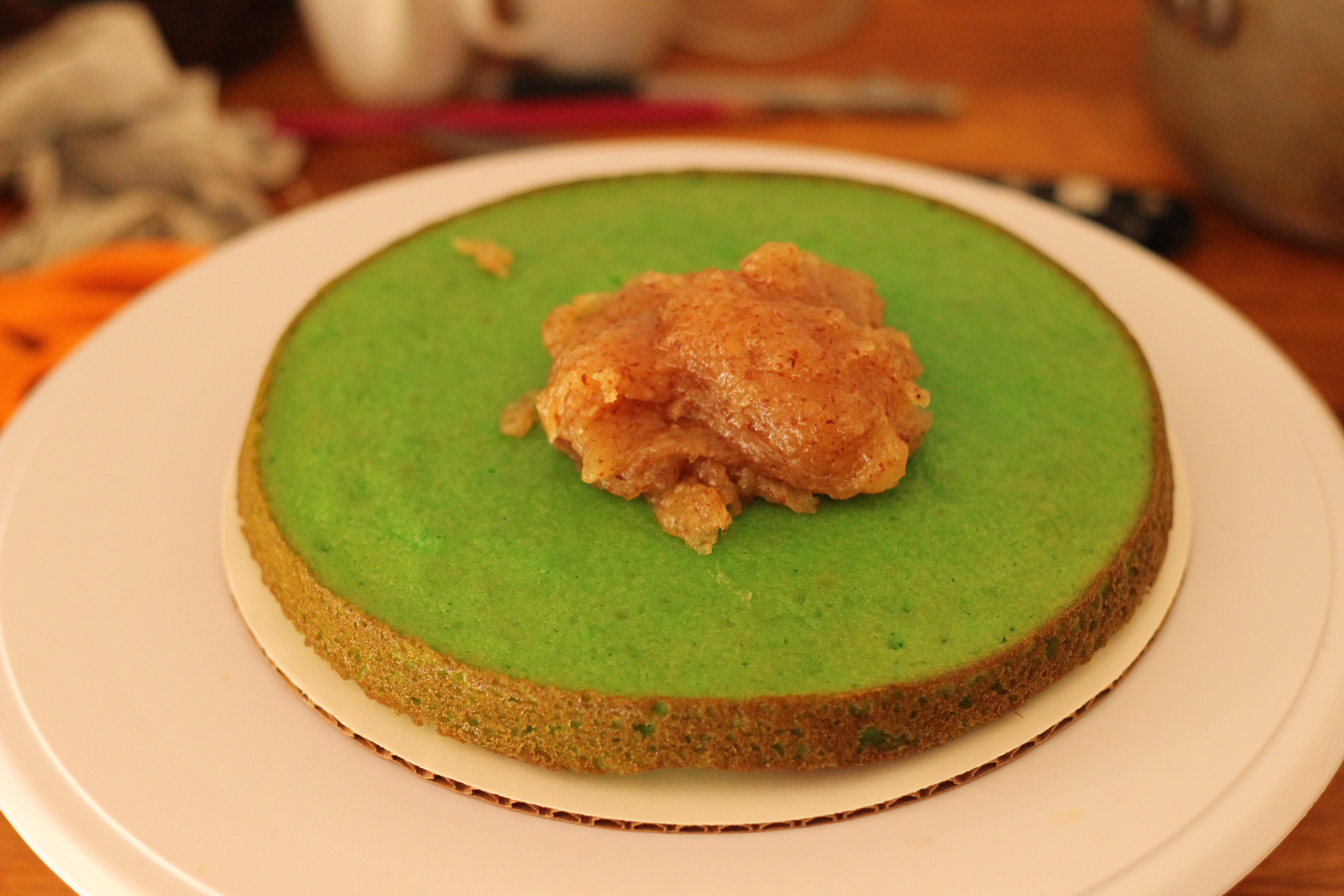 - Next, invert the yellow cake layer as before onto a saran lined cake board. Remove parchment from bottom and carefully place over the green layer. Try to line it up as closely as possible. Using a serrated knife, carefully trim the dome to level the cake. Spread apricot jam evenly, to the edges.