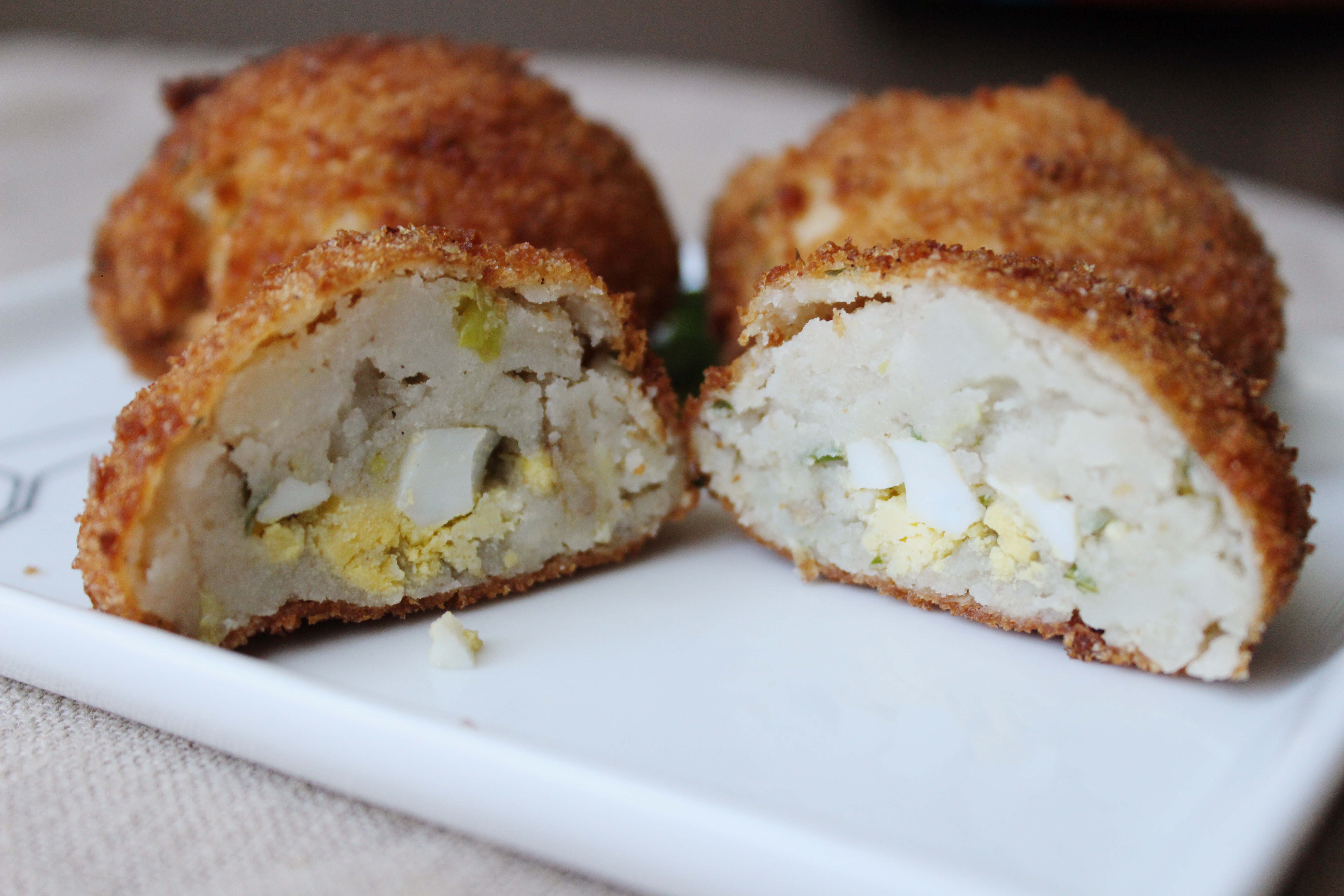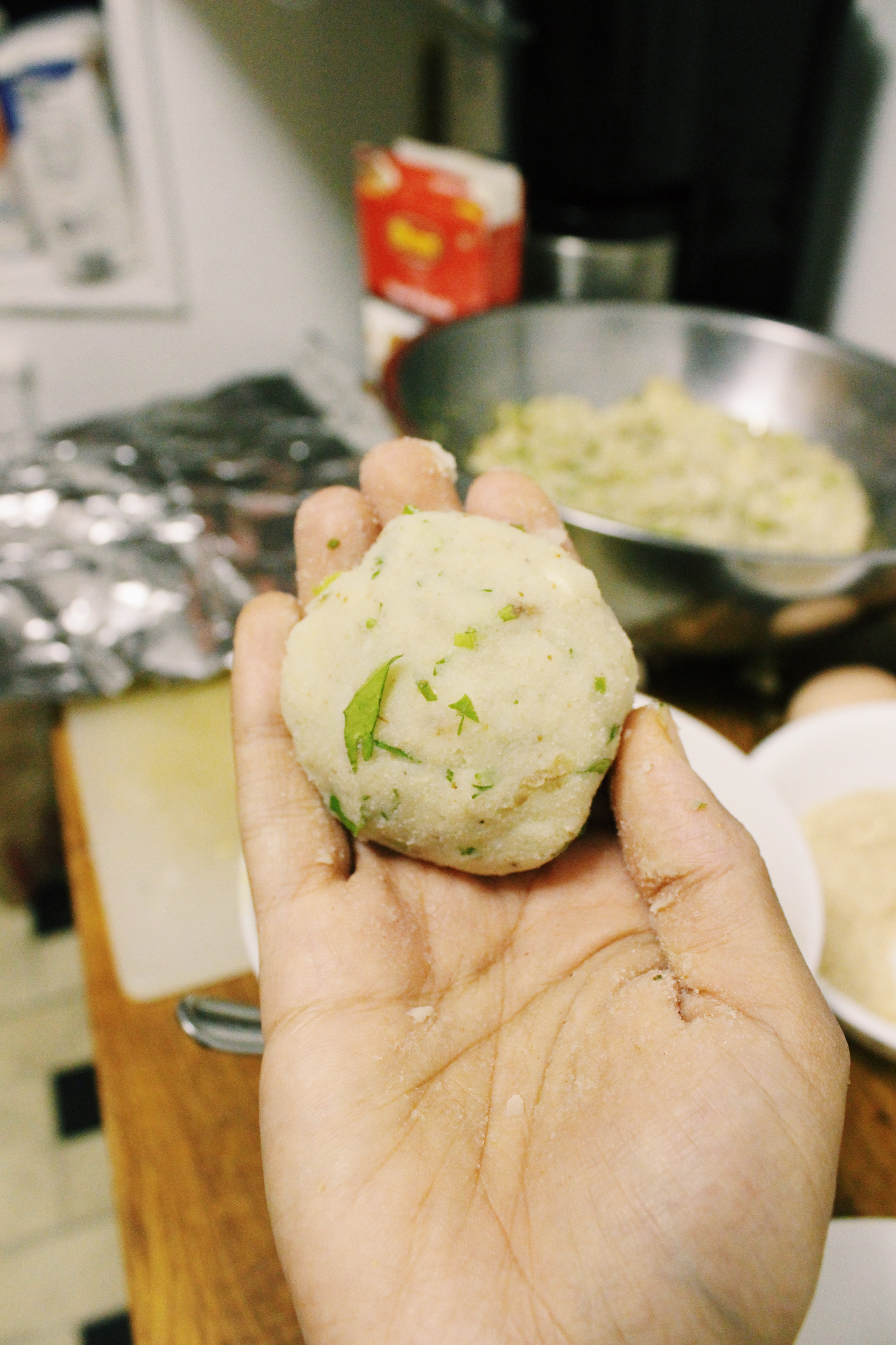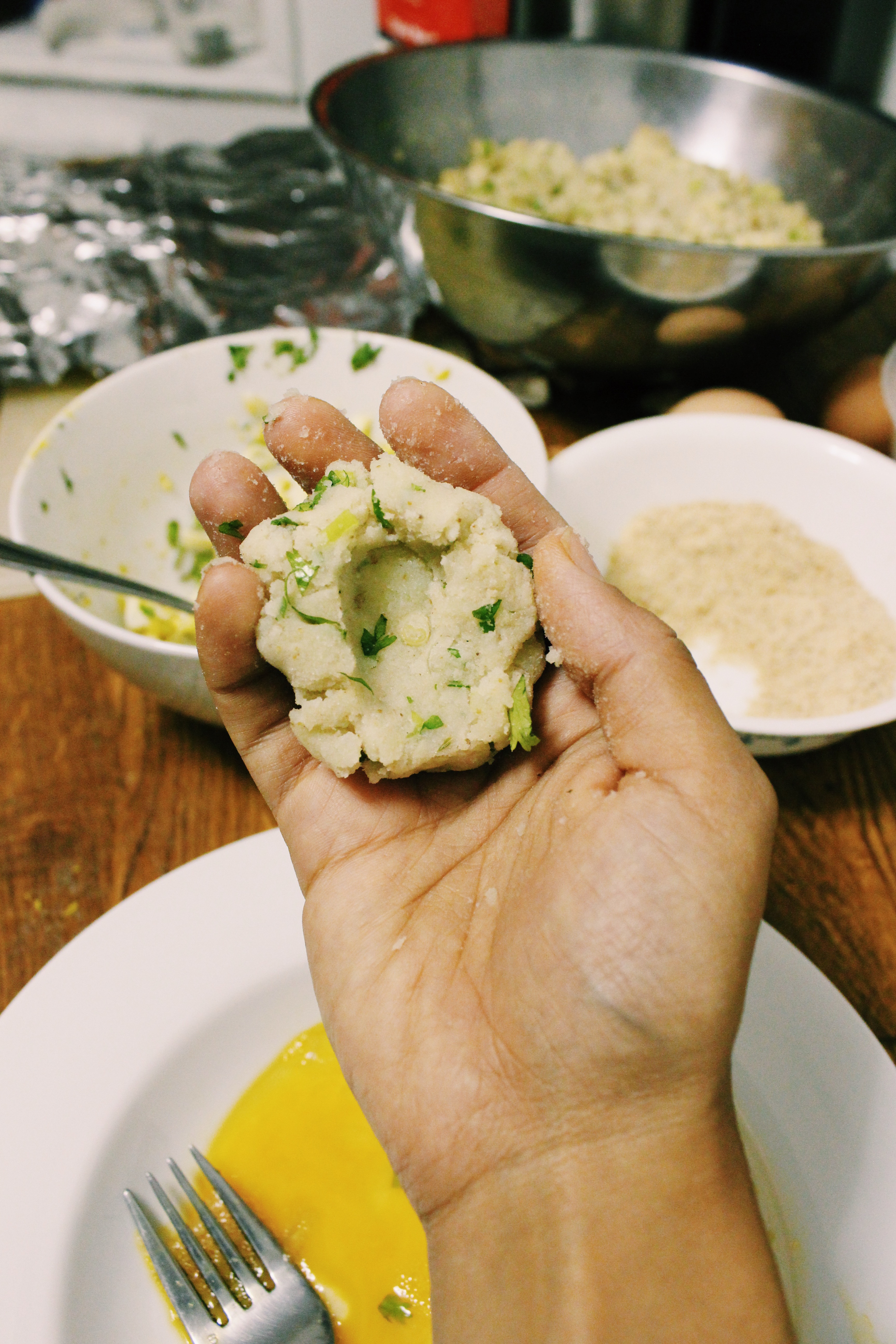 - Make balls with the mashed potato mixture by grabbing a handful, rolling into a ball, pressing in to make an indent (see picture above), and fill with a tiny bit of the egg mixture. Enclose the egg mixture fully with the edges of the potato ball. Set aside on a plate or baking sheet and continue making the rest of the balls. At this point you can freeze the balls and fry them off at a later time as needed.